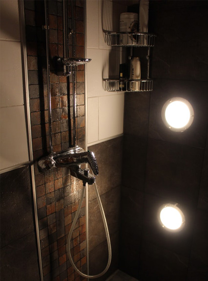 Água aquecida através de energia eléctrica gerada por painéis fotovoltaicos.