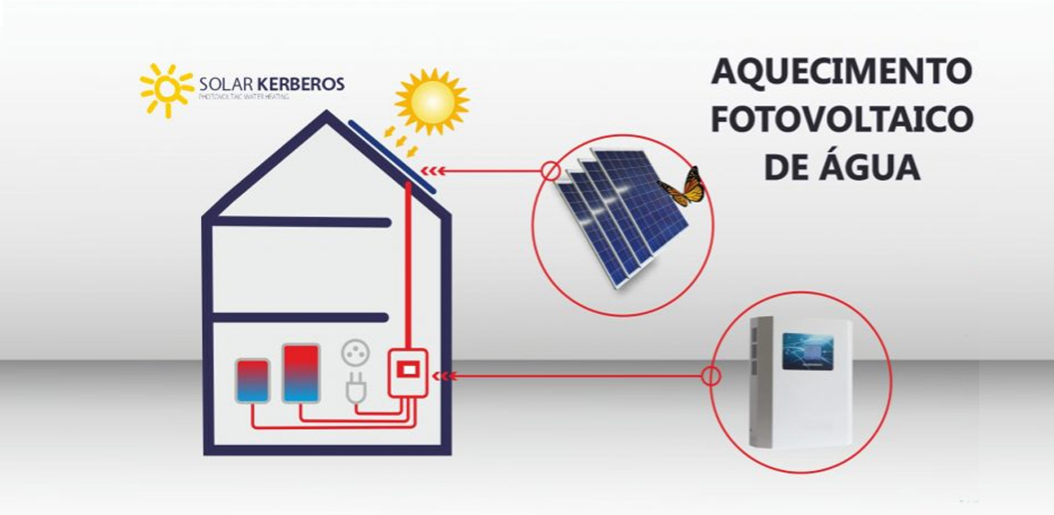 Água aquecida através de energia eléctrica gerada por painéis fotovoltaicos.